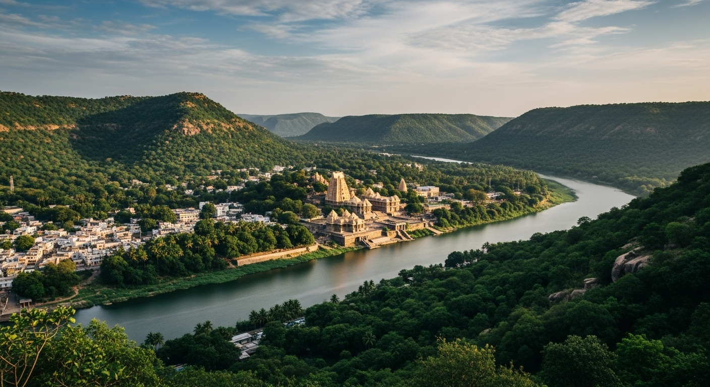 The great Srisailam Temple sits by the calm Krishna and Penna rivers. It’s a quiet place for thinking and finding out new things. This area is filled with beautiful sights and a peaceful vibe.