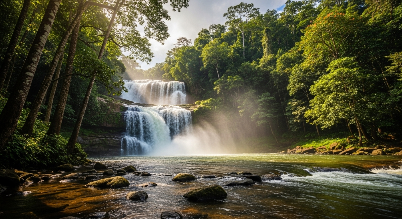 - Embodies a rare spectacle where the serenity of lush forests meets the majesty of cascading water.